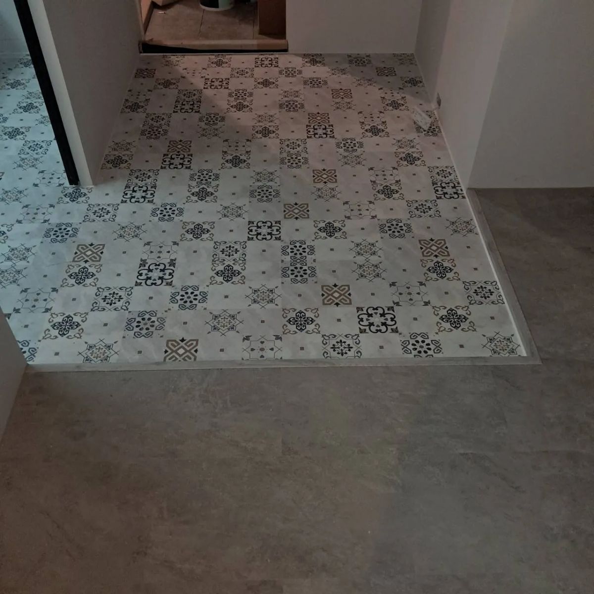 SPC 花磚地板以石塑結構為基礎,具備良好的防水性與穩定度,相較傳統磁磚,施工時間短、維修彈性高,也能呈現豐富的花紋變化。此類地板常應用於玄關、餐廳、廚房、店面或局部造型區域,作為空間風格的重點設計。